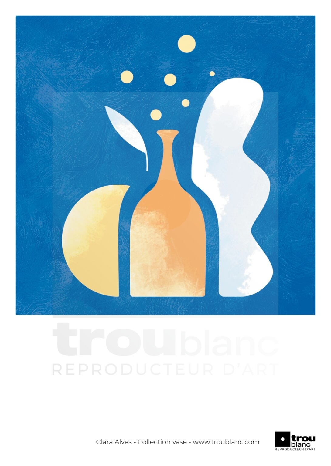 Illustration d’un vase orange sur fond bleu texturé avec des nuages et des formes rêveuses