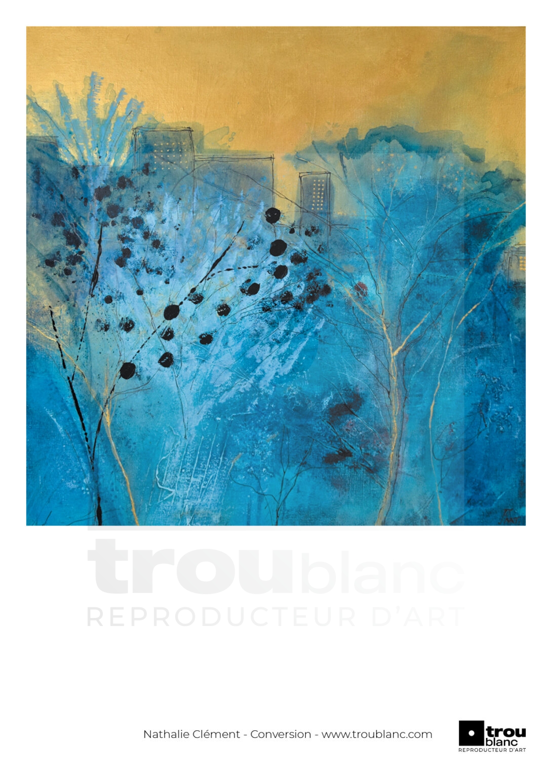 Dans les peintures à l’acrylique de Nathalie Clément, la recherche des couleurs et de la luminosité constitue son travail principal : cette étude des lumières du jour avec leurs contrastes, leurs ombres bleues et leurs éblouissements d’or, reflète une nature lumineuse et gaie.