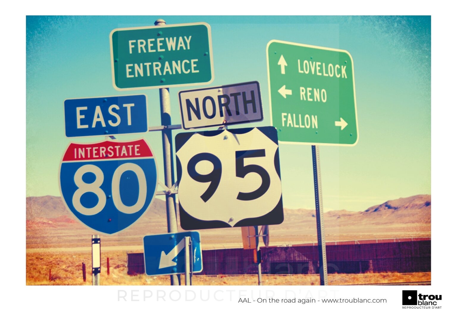 Photo vintage dans l’esprit road trip américain. La photo montre une série de panneaux routiers qui appellent à l’évasion et à la liberté.